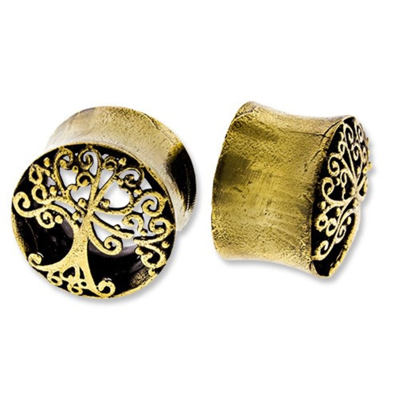 These double flare tree of life tunnels are made fromyellow brass. They have a wearable area of 5/16″ between flares. Choose your size below.