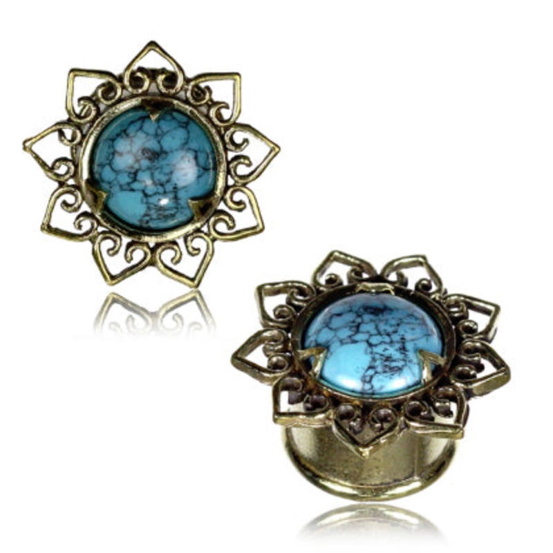 These double flare turquoise bali heart plugs are made fromyellow brass. They have a wearable area of 5/16" between flares. Choose your size below.