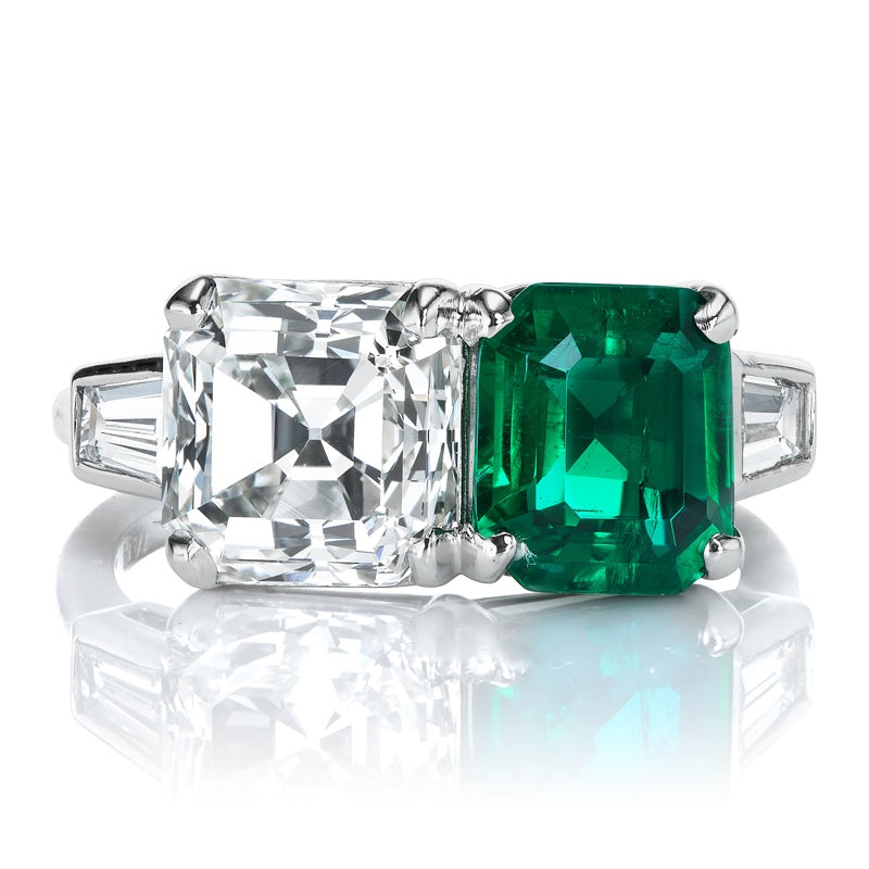 Asscher Diamond and Emerald Toi et Moi RingTheBraxton 2.90ring is an AB original design made right here in NYC. The ringfeatures a GIA-certified 2.90-carat Asscher Cut diamond ofJ color,VS1 clarity and a 1.68-carat C Dunaigre-certified Octagonal cut Zambia