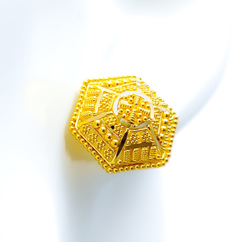 These exquisite 22k gold earrings, weighing 6.4 grams, showcase a striking hexagonal design that radiates modern elegance. The polished yellow gold finish enhances their geometric charm, creating a sophisticated yet versatile look. With a 0.75-inch diameter, these earrings offer a bold yet refined presence, secured with a sturdy screw-back post for comfortable and secure wear. A perfect fusion of contemporary style and timeless craftsmanship, these earrings are an essential addition to any fine jewelry collection.