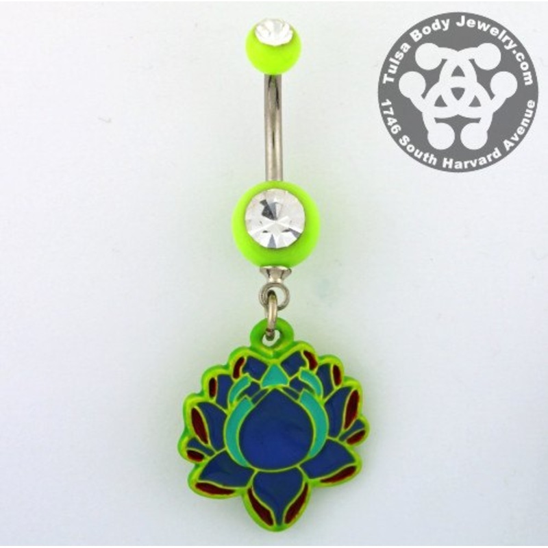 The 14 gauge bright lotus belly dangle is made from 316L stainless steel with external threading. Only the 5mm ball end is removable. Choose your color below.