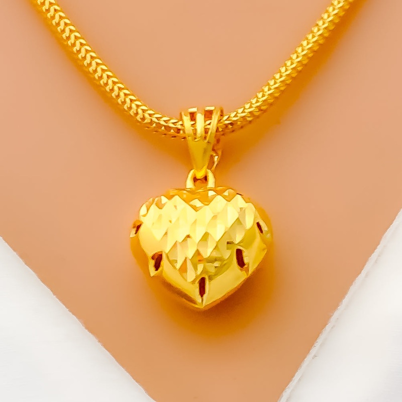 This 22k gold pendant, with a weight of 2.2 grams and a length of 0.8 inches, features a bright, palatial heart design in yellow gold. Without a chain, its beauty shines independently, capturing the essence of opulence and affection. This piece stands as a