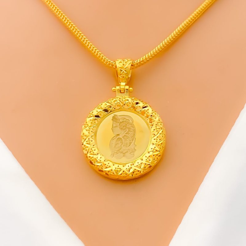 Dive into elegance with this 21k yellow gold coin pendant. Weighing 4.1 grams and boasting a radiant finish, it measures 1.3" in length. Please note, the chain is not included. A timeless addition to any collection.PRODUCT DETAILSGold Purity(karat):21kGold
