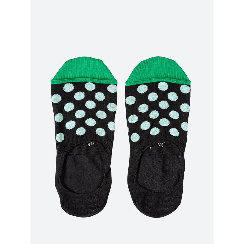 Men's black no show socks featuring a bright spot pattern and internal rubber heel grips.No show socksBright green hand linked toesInternal rubber heel gripsMaterialsFabric Content: 75% mercerized cotton, 22% polyamide, 3% elastaneMade in ItalySize GuideOn