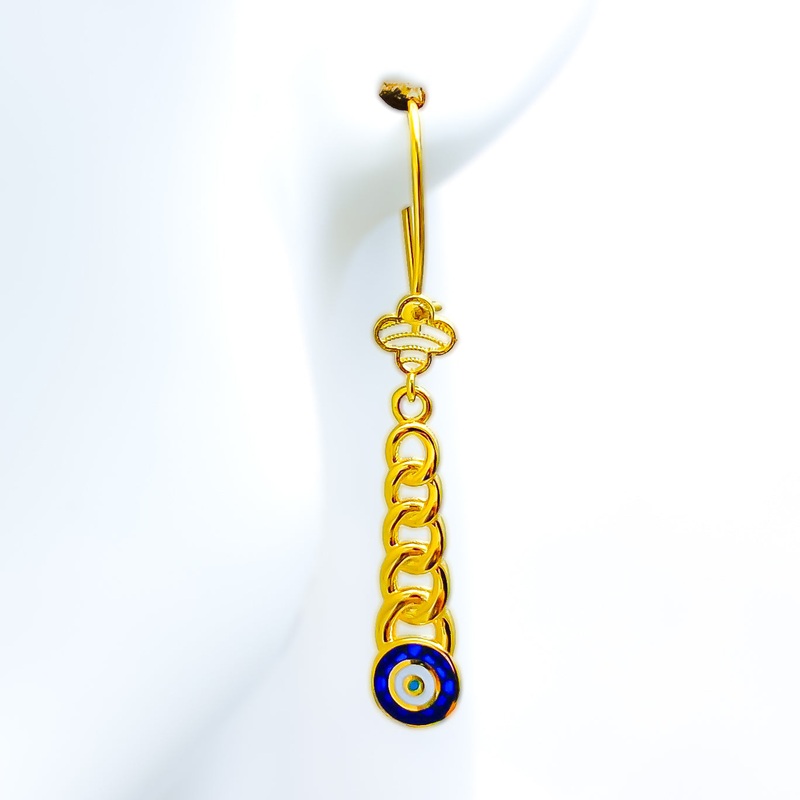 Vibrant and elegant, these 21k yellow gold hanging earrings showcase a stunning design that blends classic craftsmanship with a lively touch. Weighing 3.7 grams, their radiant gold finish enhances the intricate detailing, creating a captivating shimmer. Measuring 1.8 inches in length, these earrings offer graceful movement, making them perfect for festive occasions and refined everyday wear. Secured with a comfortable hook-back post, they ensure effortless wear and a secure fit. Designed for those who appreciate bold elegance with a hint of color, these exquisite earrings are a brilliant addition to any fine jewelry collection.