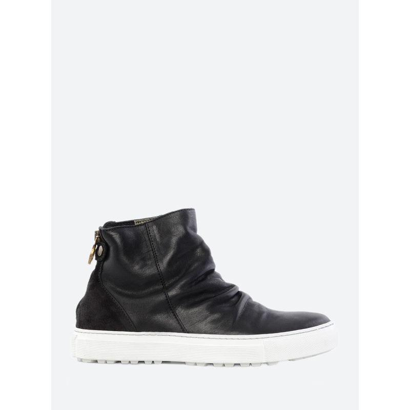 Part sneaker, part ankle boot - this versatile style will pair with anything in your closet.High top sneaker bootRuched vampBack zip closureContrasting white outsoleMaterialsUpper: leatherLining: leather Outsole: rubberSize GuideFits large and slightly wid