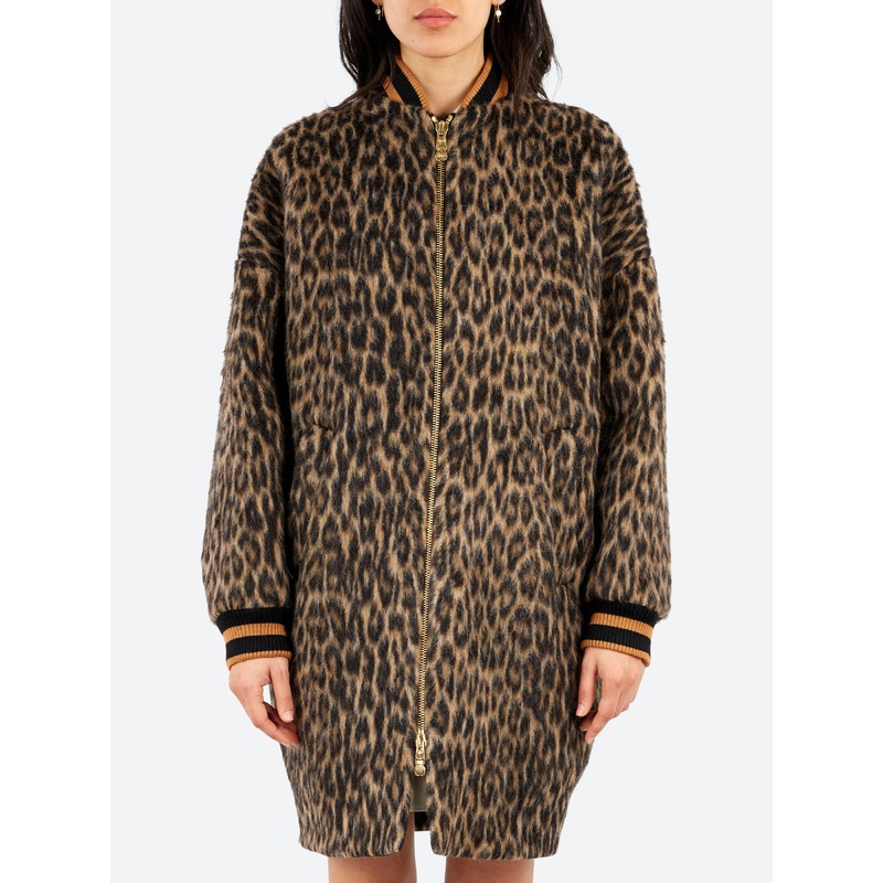 The Brooklyn Coat has a laid-back, oversized fit, perfect for layering. Arriving in this always on trend cheetah print this goes with absolutely everything. The contrast collar and cuffs add that 80s varsity vibe.Knit collarTwo-way front zipper closureCont