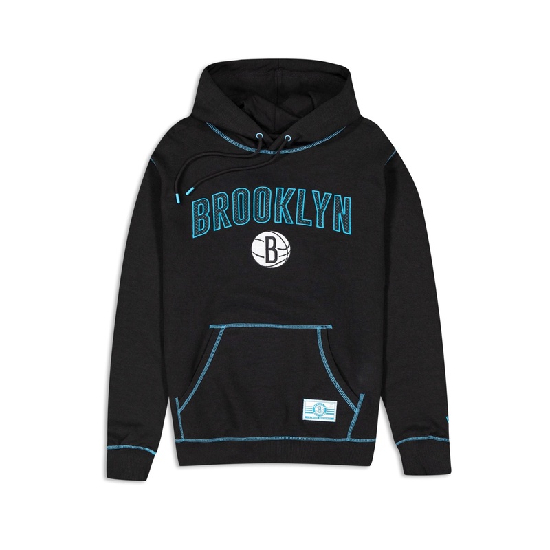 The Brooklyn Nets 2023 City Edition Black Hoodie features a mesh applique Nets wordmark and embroidered team logo at the chest with a team jock tag at the kangaroo pocket.