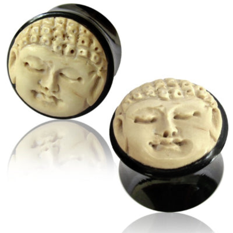 These double flarebuddha face plugs are made from handcarved water buffalo horn withwood inlay. Choose your size below.