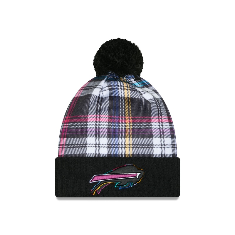 The Buffalo Bills 2024 Crucial Catch Sport Pom Knit Hat features an embroidered Bills logo at the front cuff with a Crucial Catch Patch at the right-wear side and an NFL Shield at the rear. Additional details include a plaid crown and a one-time removeable