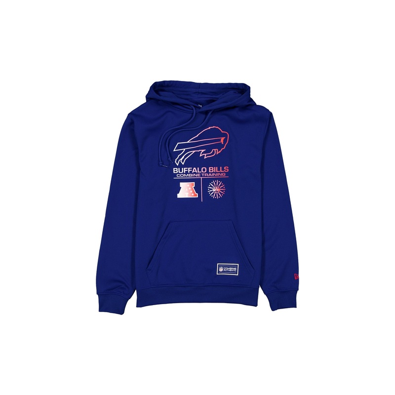 The Buffalo Bills 2025 Training Hoodie features a screen-printed Bills logo and team wordmark above an AFC logo and city flag at the chest. Additional details include a heat-sealed NFL Combine Authentic jock tag at the kangaroo pocket.Fabric: 100% Polyeste