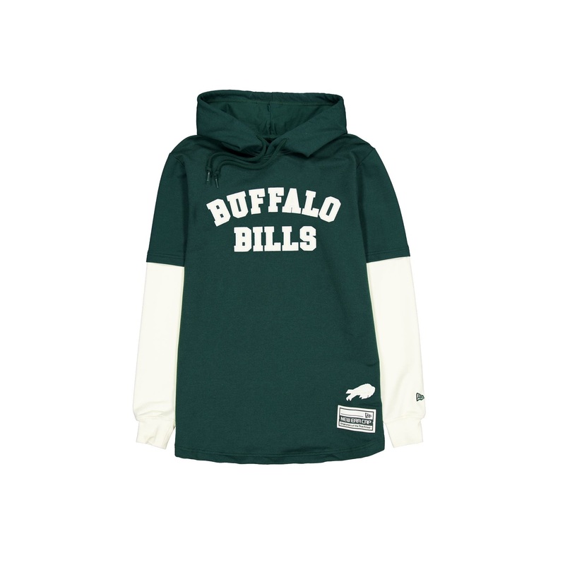 The Buffalo Bills Dark Green Logo Select Hooded T-Shirt features a zig zag stitched twill applique Bills wordmark at the chest with an embroidered team logo above a woven tag at the left hip.