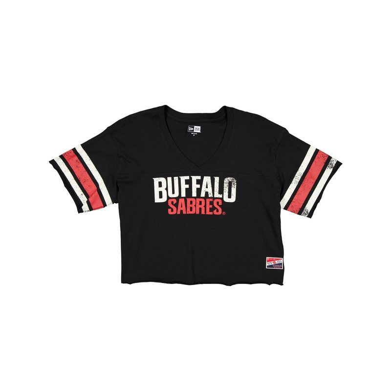 The Buffalo Sabres Alternate Throwback Cropped Women’s T-Shirt features a screen-printed Sabres graphic at the front with a New Era jock tag at the left hip. This shirt has a cropped fit.