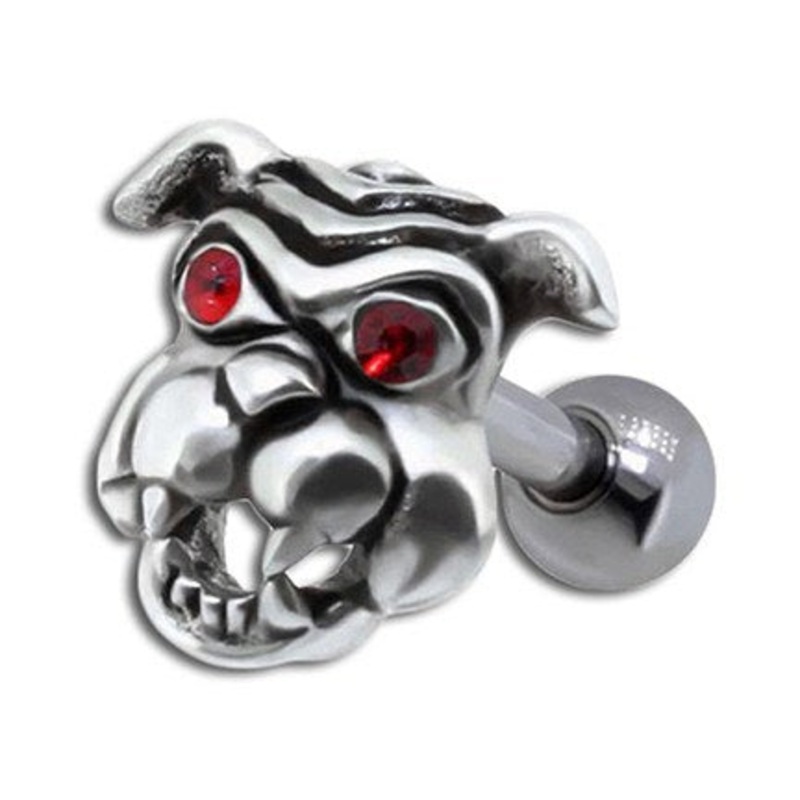 The 16 gauge bulldog cartilage barbell is made from externally threaded 316L stainless steel. Only the 2.5mm ball is removable. The hinged jaw moves up and down.