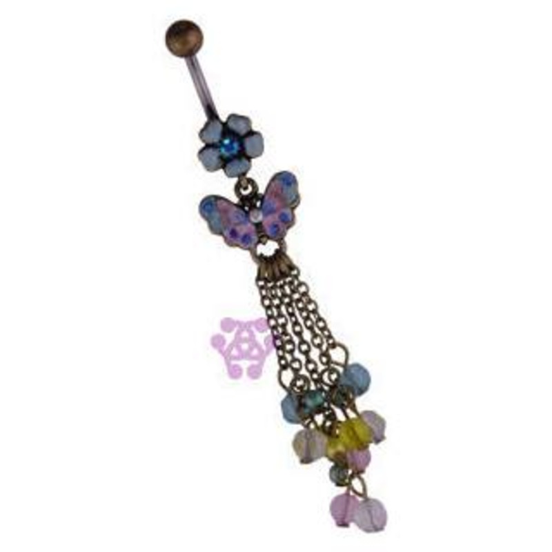 The 14 gauge butterfly vintage belly dangle is made from 316L stainless steel with external threading. The detachable 5mm ball, chain and settings are made from brass with an enamel butterfly dangle.