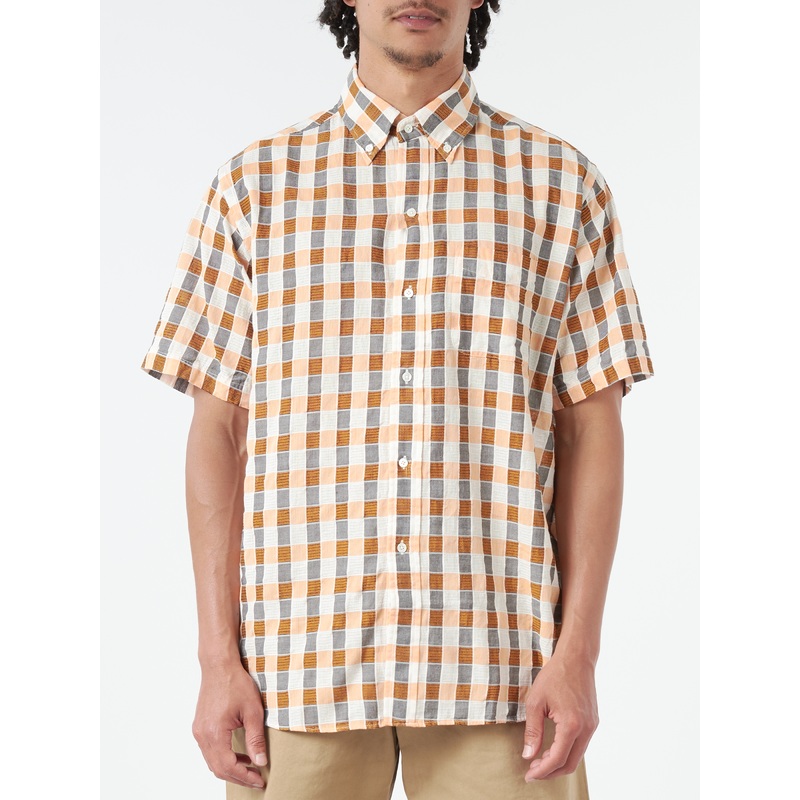 A BEAMS PLUS short sleeve button-down shirt in classic fit made of a karami dobby check fabric woven using a genuine karami loom.Button-down collarFront button closureChest pocketShort sleeveRounded hemRelaxed fitMaterialsFabric Content: 100% cottonMade in