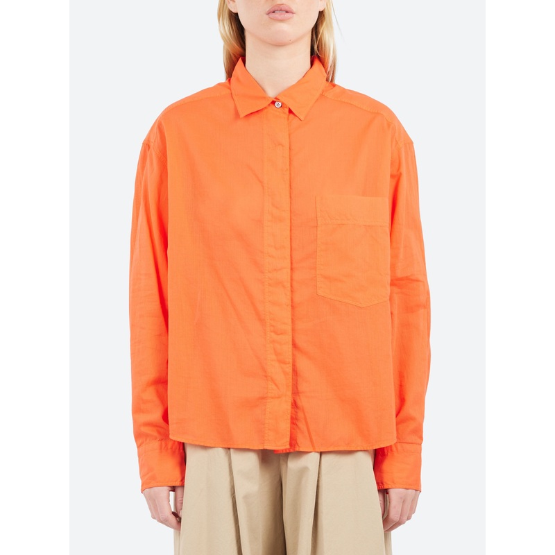 Feminine materials reinterpret the style of the Pomandre shirt. The fabric made of pure cotton, enhances the masculine-inspired design. The model features clean lines, including a hidden button placket with a single visible button. A patch pocket and slightly voluminous shapes complete the comfortable fit of the garment.