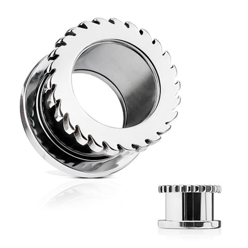 These screw-on buzzsaw tunnels are made from 316L stainless steel with external threading.They have a wearable area of 1/4" between flares. The back side unscrewsfor easy insertion. Choose your size below.