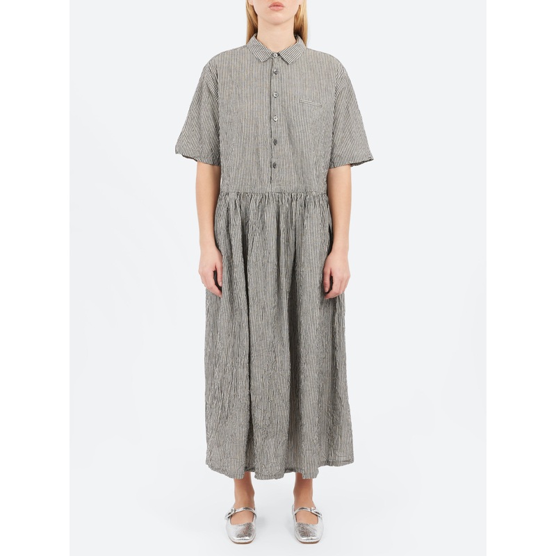 The Pas de Calais short-sleeve shirt dress features natural stripes and a gathered skirt, crafted from a densely woven cotton-linen fabric with a crinkled texture. The dress also has slightly dropped shoulders, side seam pockets, and a back yoke, creating a relaxed yet stylish look.