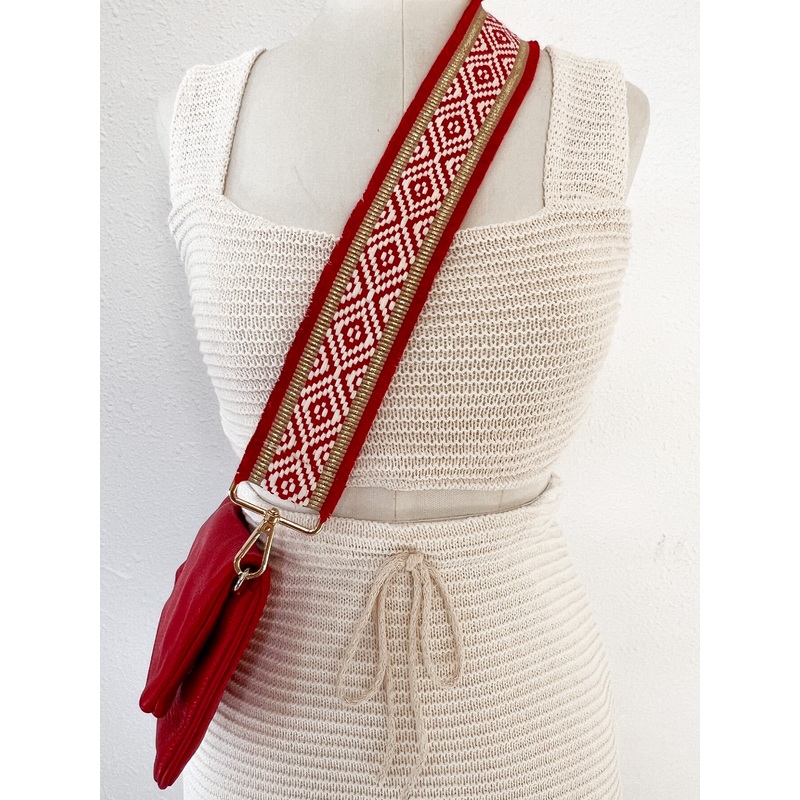 Cadena bandolera de multicolor con acabados rojos y dorados. La largada de puede ajustar y llevarlo tipo baguette o bandolera (bolso no incluido)