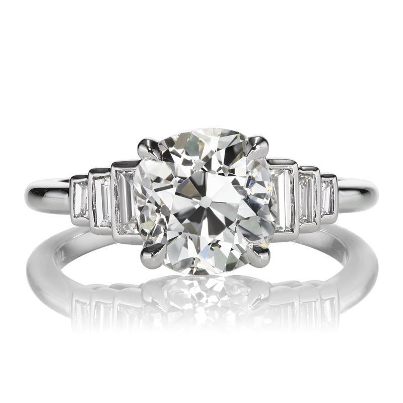 A bright white beauty, this gorgeous old mine cut diamond sits pretty in an Art Deco-inspired setting. Step-down baguettes perfectly frame the center stone and give the perfect amount of coverage across the finger. An absolutely timeless piece!