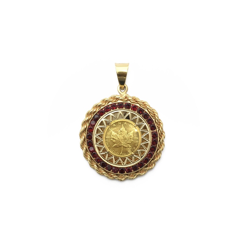 A rope design frame along with a series of faux rubies encloses a zig-zag pattern that ornaments a gold maple leaf coincontaining 1/10 oz of.9999 fine gold. The coin features a maple leaf, one of Canada's most iconic symbols.Precious Metal: 14 Karat Yellow
