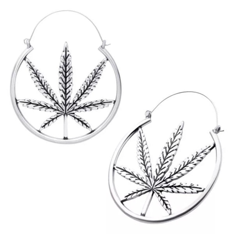 These 20 gauge cannabis hoop earrings have a bright silver finish. They measure about 63mm wide by 73mm high. The hinged post is made from 316L surgical steel. They can be worn as regular earrings, but the oversize design is intended to fit comfortably inside most flesh tunnels. Sold as a pair.