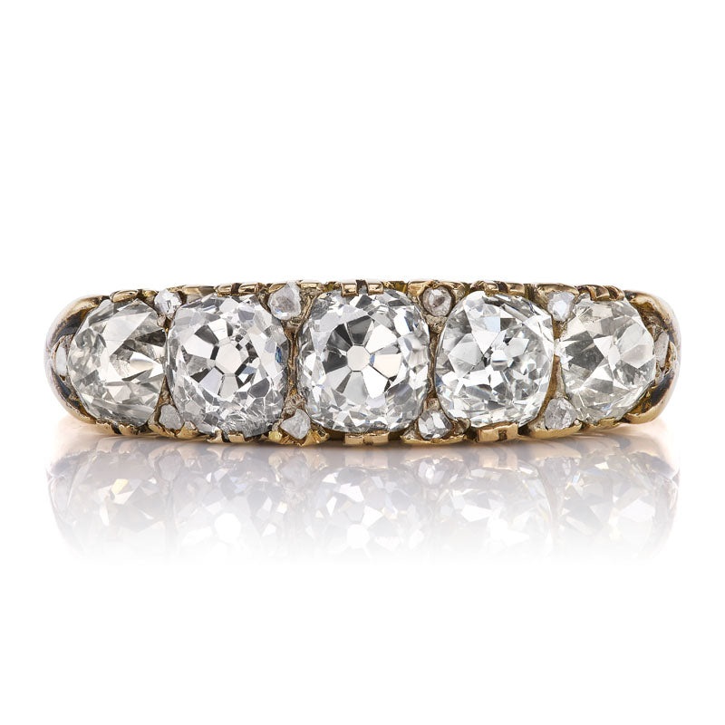 The Canterbury ring is an authentic antique diamond ring from the Edwardian Era circa 1910. The ring features five Old Mine Cut diamonds of K-L-M-Ncolor, SI-I clarity. These stones combine for an approximate total of 1.50 carats. The stone is set in a 14kt Yellow Gold half hoop setting with the cutest heart-themed details. The ring is currently size 5.5 and can be resized!