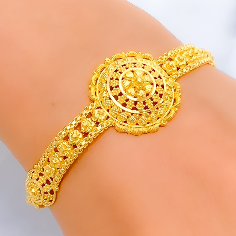 This exquisite 22k gold bracelet, weighing 9.4 grams, features a captivating heart mandala design that exudes elegance and charm. The yellow gold finish enhances its radiant appeal, making it a perfect accessory for any occasion. With a bracelet length of