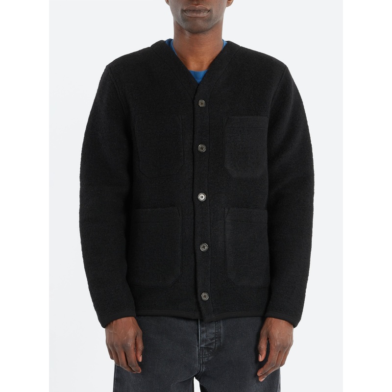 Becoming a Universal Works classic their easy to wear cardigan has a self bound button front, 3 outer patch pockets and a fourth on the inside. Cotton rib bound cuffs and hem.