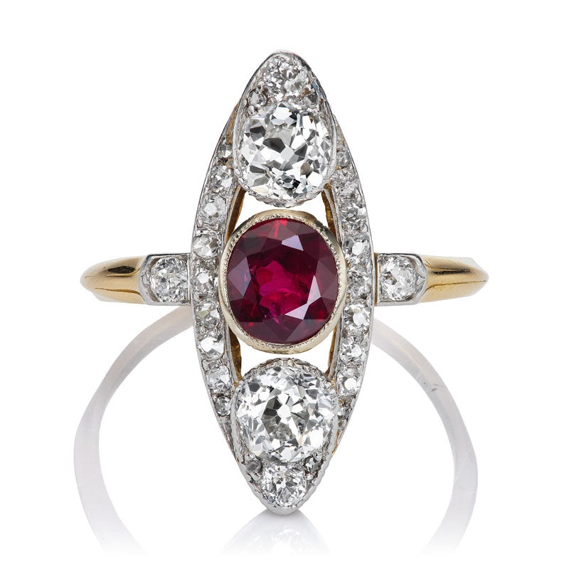 TheCariaring is an authentic vintage ruby diamond ring from the Edwardian Era circa 1910. This ring centers aGIA-certified Oval Cut Natural Heated Thai ruby of approximately 0.90 carats. Above and below the ruby is an Old Mine Cut diamond, each of approximately 0.55 carats, with additional surrounding diamonds totaling approximately 0.30 carats. All of the diamonds are of approximately I-J color, VS-SI clarity. The stones are set in a two-tone platinum and 18kt yellow gold setting. The ring is currently size7 and can be resized!