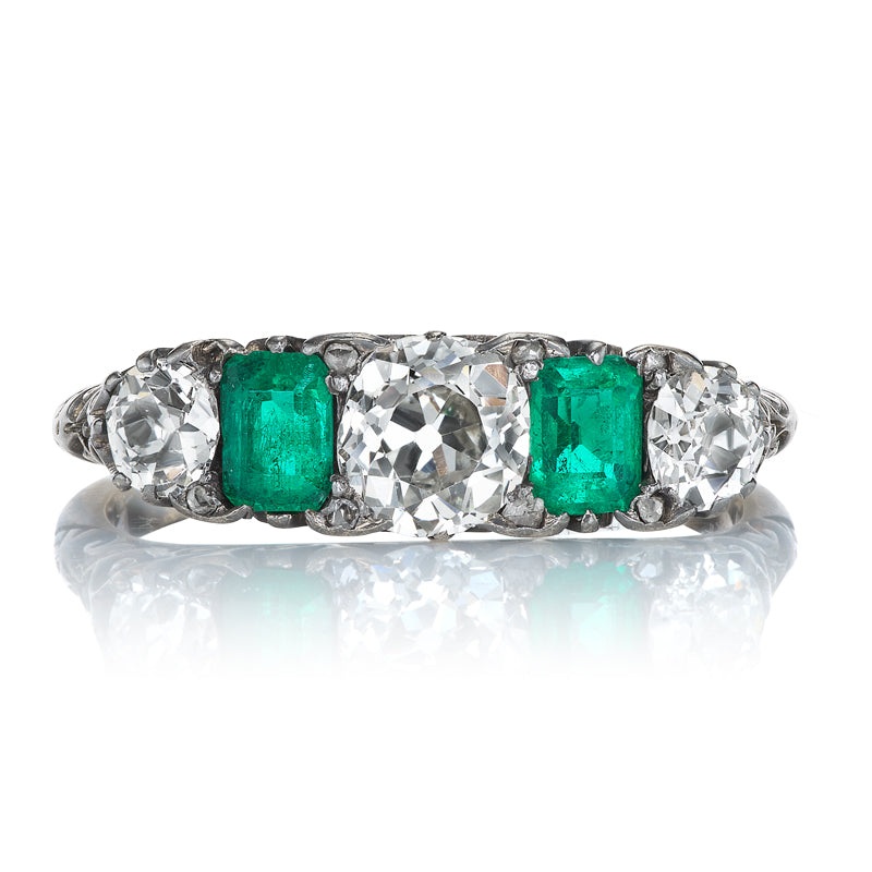 Antique Diamond and Emerald Half HoopThe Carlita ring is an authentic vintage diamond and emerald ring from the Edwardian Era circa 1900. The ring features two emeralds totaling approximately 0.50 carats and three Old Mine Cut diamonds of approximately J-K