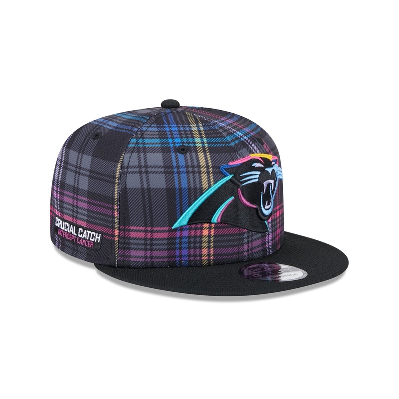 The Carolina Panthers 2024 Crucial Catch 9FIFTY Snapback features an embroidered Panthers logo at the front panels with a Crucial Catch Intercept Cancer patch at the right-wear side. Additional details include an NFL Shield above a snapback closure at the