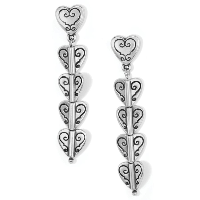 These earrings with beveled hearts feature a simple edge scrawl etched on each heart for a contemporary look that works well with everything in your wardrobe.