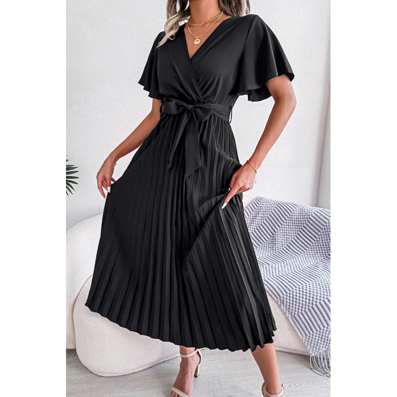 Casual solid color pleated V-neck high waisted skirt for evening dress