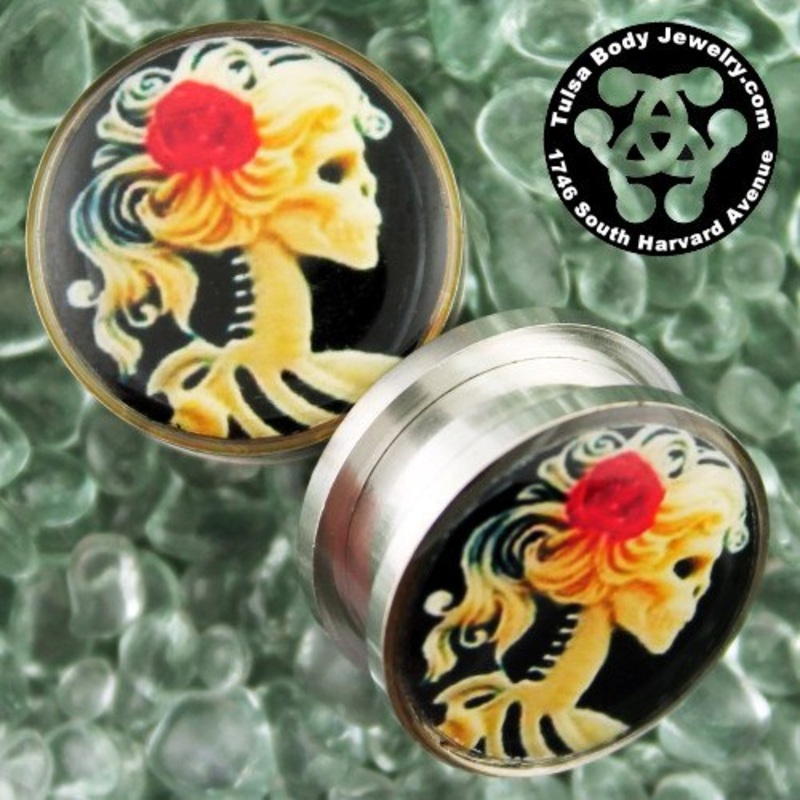 These screw-on catrina cameo plugs are made from 316L stainless steel with external threading.They have a wearable area of 1/4" between flares.The back side unscrewsfor easy insertion. Choose your size below.