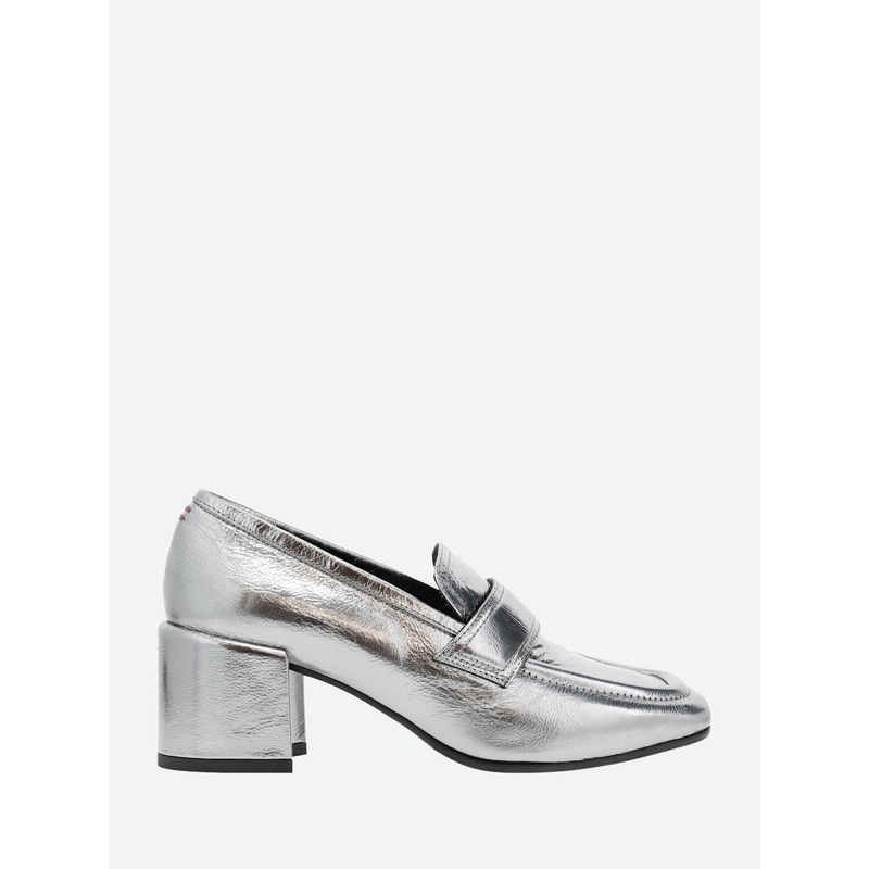 Halmanera heeled loafer in shiny leather. A slip-on style for easy on and off. Finished with a self covered wooden heel.Slip-on styleStitched strap across the vampTonal stitchingSquare toeGeometric heelMeasurements:30mm heelMaterialsUpper leatherLining: le