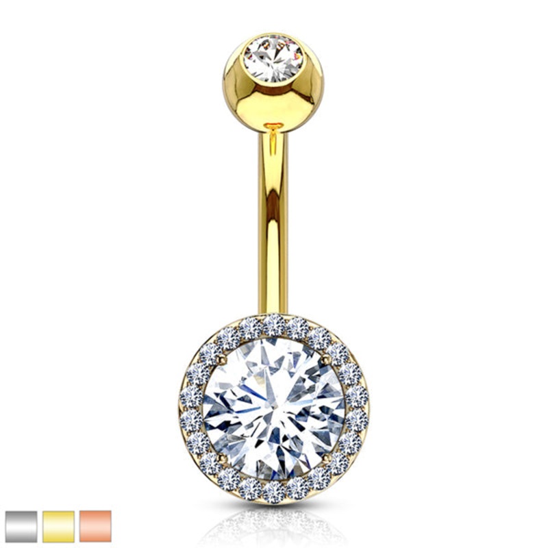 Center CZ Belly Ring 14g – 3/8″ long (10mm) Clear Gold Stainless