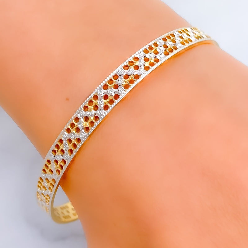 This unique bangle combines 22k gold’s luxury with an innovative checkered design, featuring alternating yellow and white gold for a striking appearance. Weighing 13.6 grams and sized at 2.6 with a bangle opening of 2.35 inches, it offers both elegance and comfort. The single-piece construction emphasizes its exclusivity and design ingenuity. Perfect for those seeking a statement piece that blends traditional gold craftsmanship with contemporary style, this bangle is an eye-catching addition to any jewelry collection, promising to captivate attention and complement a range of outfits.