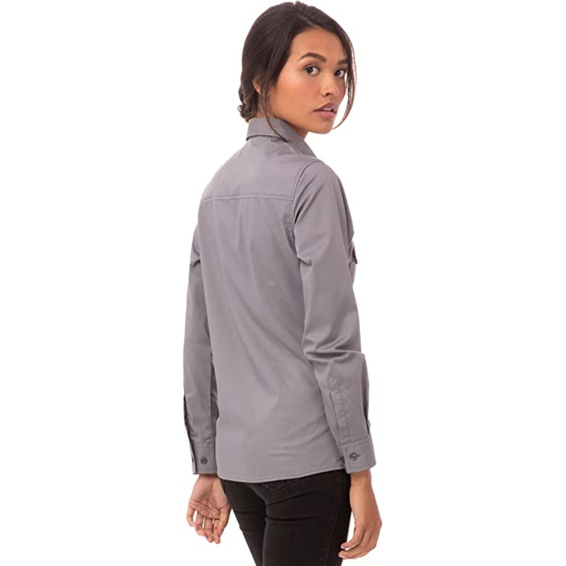 A ladies fit modern shirt with practical features including roll up sleeves and two front pockets with flaps.