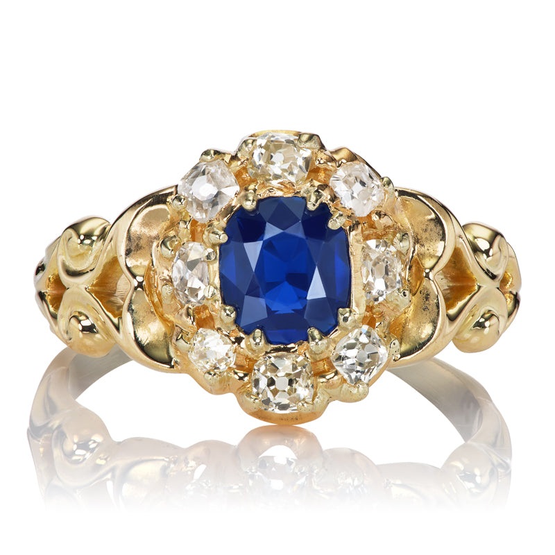 The Chenda ring is an authentic vintage diamond ring from the Victorian Era circa 1890. The ring centers a GIA-certified cushion cut No-Heat Cambodian Sapphire of approximately 1.80 carats. Surrounding the Sapphire are 8 old mine cut diamonds of approximately J-K color, SI-I clarity and combine for approximately 0.40 carats. The stones are prong set in an 18kt Yellow Gold setting. The ring is currently size 7 and can be resized!