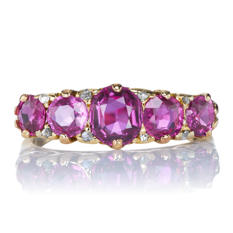 This Victorian Ruby half-hoop is a true work of art. Featuring 5 pink-toned rubies in a beautiful finger-spanning display.