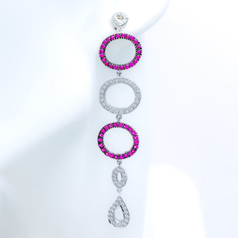 Indulge in the allure of our Chic Long Ruby & Diamond Oval Loop Earrings. Crafted in exquisite 18k white gold, these earrings exude elegance. With a weight of 17.7 grams, they offer a substantial and luxurious feel. Adorned with 1.59 carats of dazzling round brilliant-cut diamonds, they radiate brilliance. The captivating presence of 2.01 carats of round brilliant-cut ruby stones adds a touch of sophistication. These hanging earrings, measuring 3.5 inches, are a testament to refined style and impeccable craftsmanship