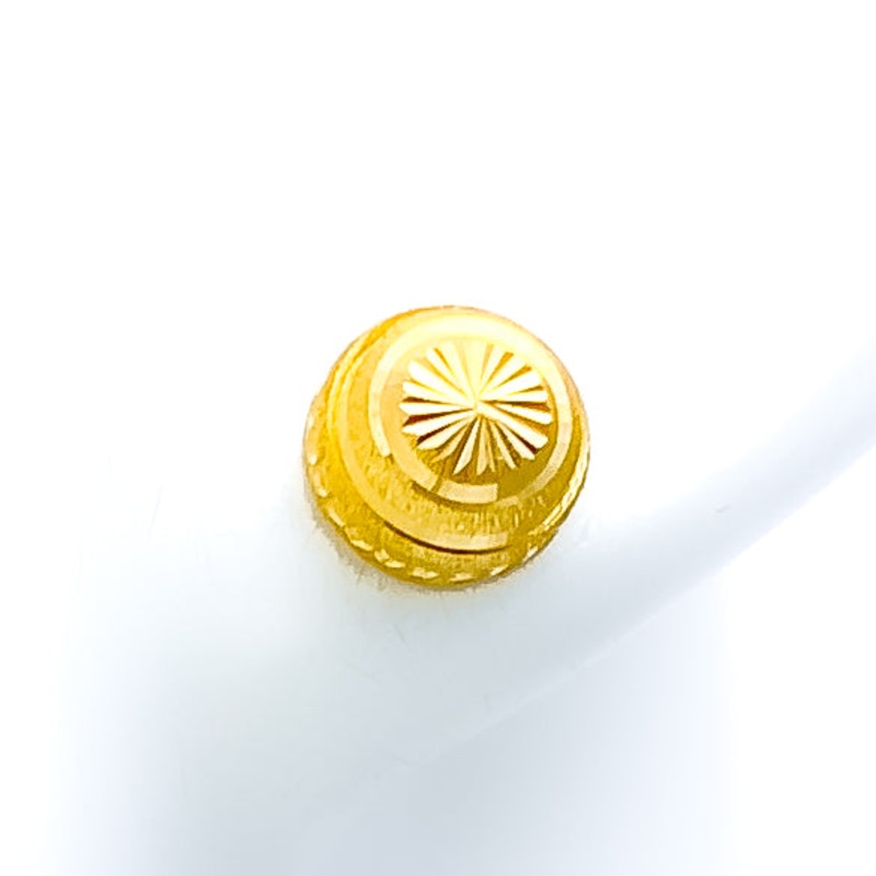 These 22k gold earrings feature a chic radiant striped design, perfect for adding elegance to any outfit. Weighing 1.9 grams, they showcase a yellow gold finish that enhances their stylish striped pattern. With a length of 0.25 inches, these top-style earrings are secured with push back posts, ensuring both style and practicality. Ideal for those who appreciate detailed and fashionable jewelry, these earrings bring a touch of luxury and radiant charm to your collection. Suitable for any occasion, they enhance your ensemble with their chic allure.