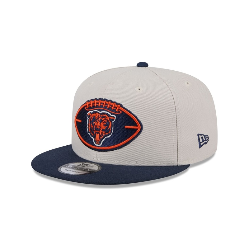 The Chicago Bears 2024 Historic Sideline 9FIFTY Snapback Hat features an embroidered Bears Historic logo at the front panels with a matching NFL Shield above a snapback closure at the rear.