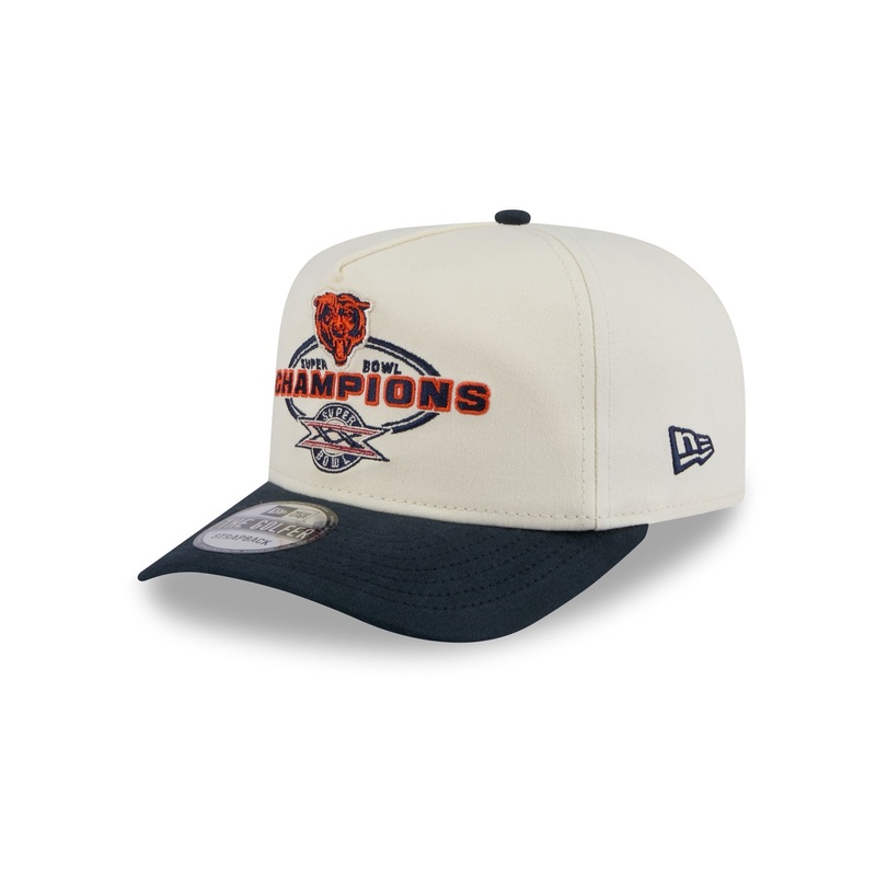 The Chicago Bears Chrome White Champions Golfer features an embroidered Super Bowl Champions wordmark and team logo at the front panels. Additional details include an NFL Shield logo at the right-rear, a strapback closure, and a green undervisor