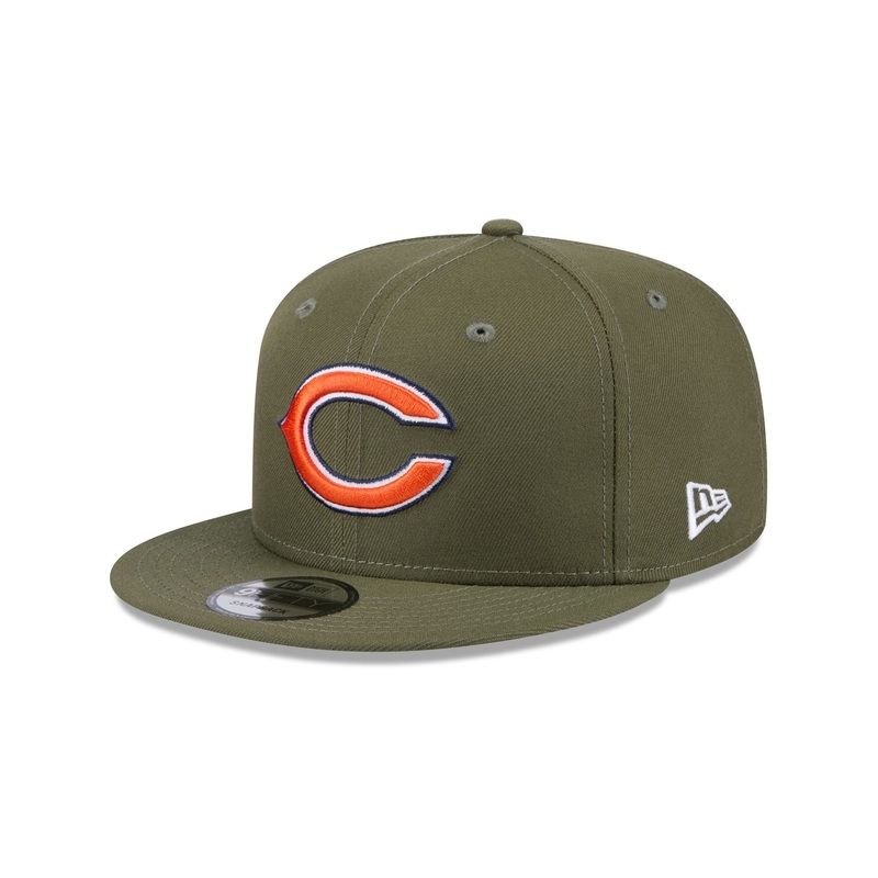 The Chicago Bears Olive 9FIFTY Snapback features an embroidered Bears logo at the front panels with a gray undervisor and a snapback closure at the rear.