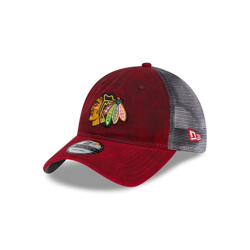 The Chicago Blackhawks Slick 9TWENTY Trucker features an embroidered Blackhawks logo at the front panels with a distressed coloring. Additional details include a mesh back with a snapback closure at the rear and a gray undervisor.