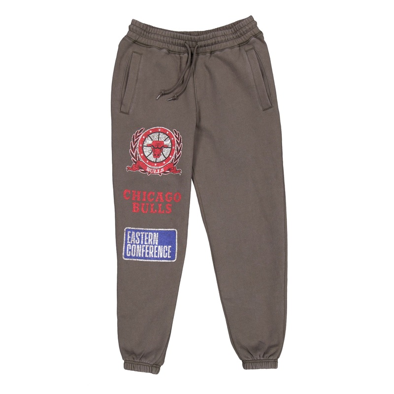 The Chicago Bulls Oversized Essentials Sweatpants features a distressed screen-printed Bulls logos and an Eastern Conference logo at the right leg.