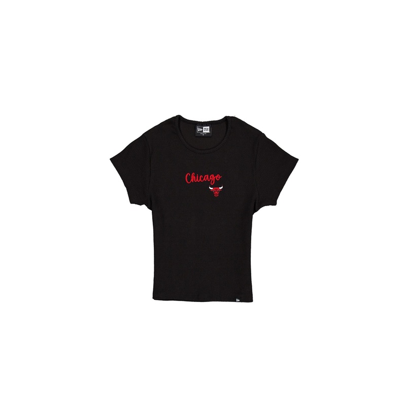 The Chicago Bulls Sport Classics Women’s Baby Tee features a chain-stitched Bulls wordmark and an embroidered team logo at the front.